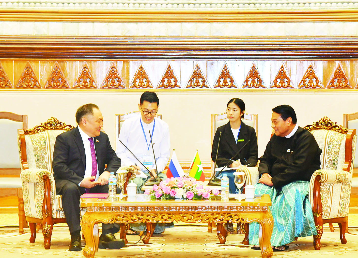 ပြည်သူ့လွှတ်တော်ဥက္ကဋ္ဌ ဦးခင်ရီသည် ရုရှားဖက်ဒရေးရှင်းနိုင်ငံ ဒူးမားလွှတ်တော် ဒုတိယဥက္ကဋ္ဌ H.E. Mr. Sholban Kara-ool ဦးဆောင်သော ကိုယ်စားလှယ်အဖွဲ့အား ယနေ့ညနေပိုင်းတွင် နေပြည်တော်ရှိ လွှတ်တော်အဆောက်အအုံ ဇမ္ဗူသီရိဧည့် ခန်းမဆောင်၌ လက်ခံတွေ့ဆုံသည်၊၊