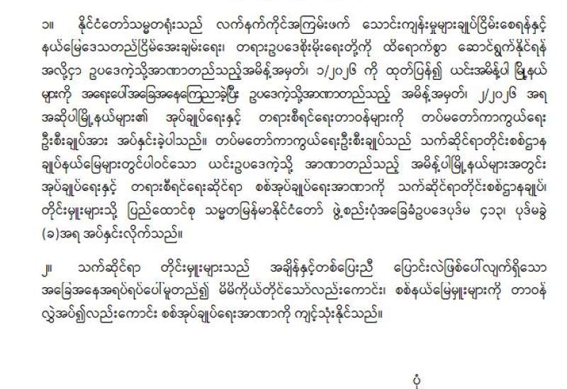 အုပ်ချုပ်ရေးနှင့်ပတ်သက်၍ စစ်ဆင်ရေး၊ လုံခြုံရေးနှင့်လေ့ကျင့်ရေးဆိုင်ရာများ အောင်မြင်ရန် အုပ်ချုပ်ရေးသည် အဓိကကျကြောင်း၊ တပ်မတော်ရုံးလုပ်ငန်းများကို ဦး၊ ရေး၊ ထောက် ထောက်တိုင် ၃ ရပ်ကောင်းမွန်စွာ လည်ပတ်မှုဖြင့် ထိန်းကျောင်းထားကြောင်း၊ စစ်စည်းကမ်းဆိုင်ရာ စည်းမျဉ်း၊ အမိန့်နှင့် ညွှန်ကြားချက်များကို လိုက်နာ၍ ဦး၊ ရေး၊ ထောက်လုပ်ငန်းများကို ဟန်ချက်ညီထိန်းကျောင်းသွားရန်လိုကြောင်း၊ အုပ်ချုပ်ရေးပိုင်းကို ပိုင်နိုင်စွာဆောင်ရွက်နိုင်ခြင်းဖြင့် အရာရှိ၊ စစ်သည်၊ မိသားစုများ၏ သက်သာချောင်ချိမှုကိုလည်း ထိရောက်စွာလုပ်ဆောင်နိုင်မည်ဖြစ်ကြောင်း။