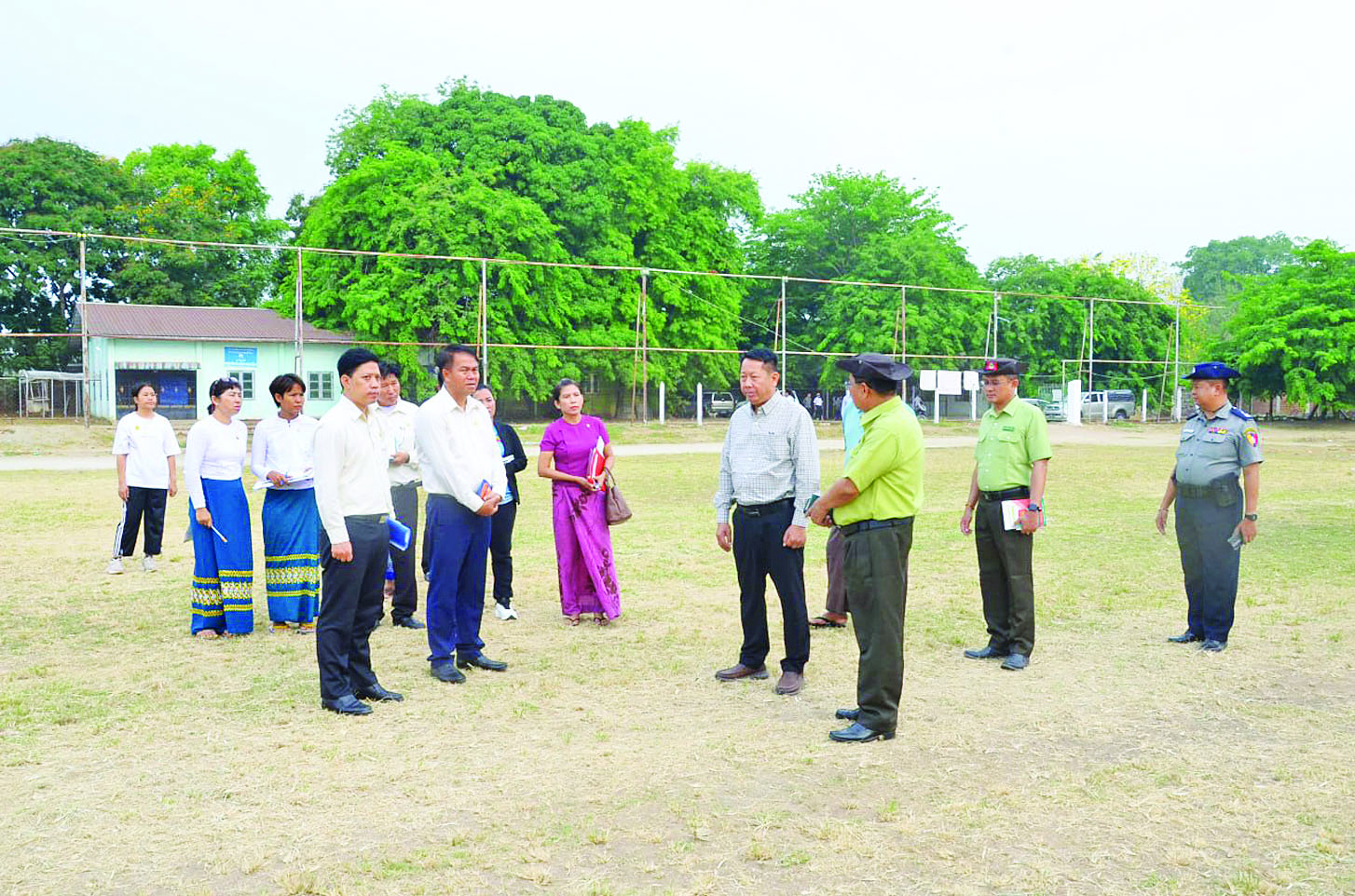 ဦးစွာ ပြည်ထောင်စုဝန်ကြီးနှင့်အဖွဲ့သည် ပဲခူးတိုင်းဒေသကြီး တောင်ငူခရိုင်အားကစားကွင်းသို့ ရောက်ရှိရာ ၉ ဒသမ ၅၆၄ ဧကရှိ အားကစားကွင်းတည်နေရာပြ မြေပုံပါအတိုင်း ခြံစည်းရိုးအုတ်တံတိုင်း ၂၂၅၆ ပေ ကာရံထားမှုအခြေအနေ၊ ၇ ဒသမ ၈၁၆ ဧကရှိ ဘောလုံးကွင်းဧရိယာ Inner Fencing ကာရံ ထားရှိမှု၊ ဘောလုံးကွင်းမြက်ခင်းပြင်၊ ဂိုးတိုင်ဂိုးပိုက်များ တပ်ဆင်ထားရှိမှုအခြေအနေ၊ မီတာ ၄၀၀ မြေသားပြေးလမ်း ခင်းကျင်းထားမှုအခြေအနေ၊ ၁၄၀ x ၂၄ ပေရှိ ပရိသတ်အင်အား ၅၀၀ ဝင်ဆံ့သည့် အထူးတန်းပွဲကြည့်စင်၊ ပရိသတ်အင်အား ၁၀၀၀ စီဝင်ဆံ့သည့် ၂၀၀ x ၂၃ ပေရှိ အရှေ့ဘက် ပွဲကြည့်စင်နှင့် ၂၃၂ x ၂၃ ပေရှိ မြောက်ဘက်ပွဲကြည့်စင် တည်ဆောက်ထားရှိမှုအခြေအနေကိုလည်းကောင်း၊ ရေသုံးစွဲမှုအဆင်ပြေစေရေးအတွက် ဂါလန် ၂၄၀၀ ဆံ့ ရေစင် တည်ဆောက်ထားရှိမှုနှင့် ၁ ဒသမ ၇၄၈ ဧကရှိ မိုးလုံလေလုံအားကစားရုံ တည်ဆောက်ထားရှိမှုအခြေအနေကိုလည်းကောင်း ကြည့်ရှုစစ်ဆေးသည်။