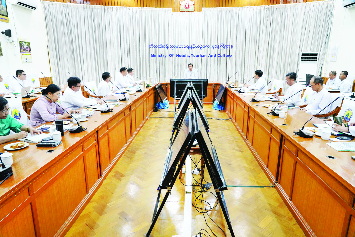 မွန်းလွဲပိုင်းတွင် ပြည်ထောင်စုဝန်ကြီးသည် ဟိုတယ်နှင့် ခရီးသွားလုပ်ငန်းများ ရေရှည်ဖွံ့ဖြိုး တိုးတက်ရေးအတွက် လုပ်ငန်းများ အကောင်အထည်ဖော်ဆောင်ရွက်ရာတွင် စနစ်တကျဖြစ်စေရေးအတွက် ဝန်ကြီးဌာနမှ တာဝန်ရှိသူများ၊ ဘာသာရပ်တာဝန်ခံများနှင့် တွေ့ဆုံဆွေးနွေးသည်။
