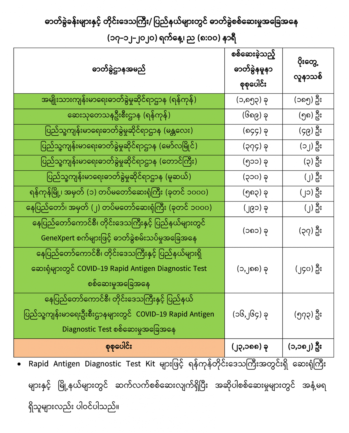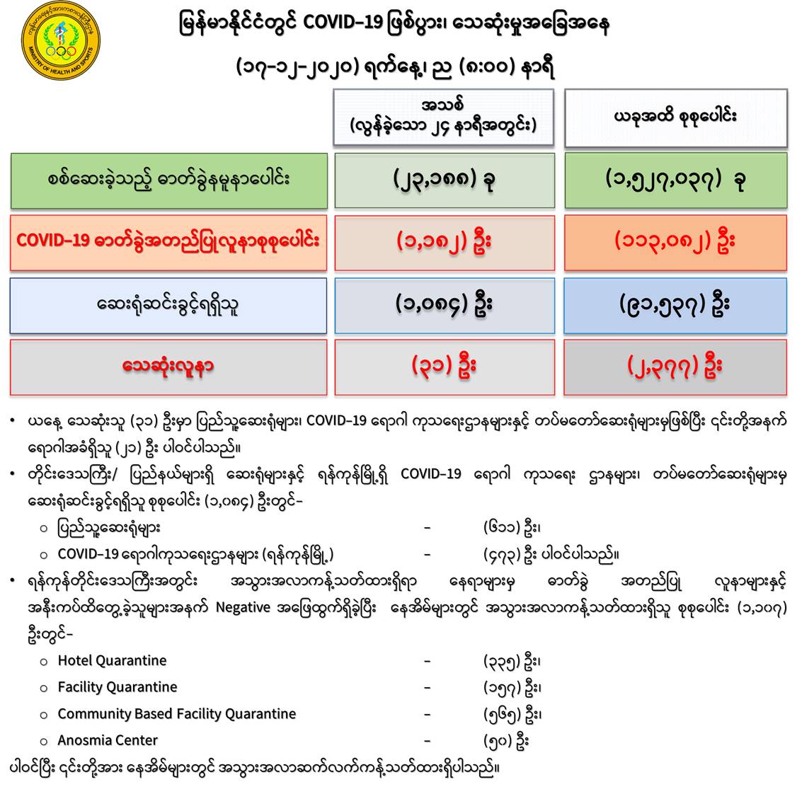 (၁၆-၁၂-၂၀၂၀) ရက်နေ့၊ ည (၈:၀၀) နာရီမှ (၁၇-၁၂-၂၀၂၀) ရက်နေ့၊ ည (၈:၀၀) နာရီ အတွင်း ဓာတ်ခွဲနမူနာ စုစုပေါင်း (၂၃,၁၈၈) ခုအား စစ်ဆေးပြီးစီးခဲ့ရာ COVID-19 ရောဂါ ဓာတ်ခွဲအတည်ပြု လူနာသစ် (၁,၁၈၂) ဦး တွေ့ရှိရပါသည်။