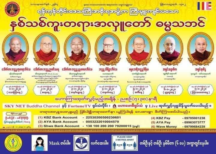 ၂၀၂၁ ခုနှစ် ၊ ဇန်နဝါရီလ ၁ ရက်နေ့မှ ၇ ရက်နေ့အထိ ညစဉ် ၇ နာရီခွဲ မှစတင်၍ တရားတော်များဟောကြားမည်ဖြစ်ပြီး ဇန်နဝါရီ ၁ ရက်နေ့ တွင် နိုင်ငံတော်သံဃမဟာနာယကအဖွဲ့ ဥက္ကဌ ဗန်းမော်ဆရာတော် ဒေါက်တာ ဘဒ္ဒန္တ ကုမာရာဘိဝံသ  ၊ ဇန်နဝါရီ ၂ ရက်နေ့တွင် သီတဂူကမ္ဘာ့ဗုဒ္ဓတက္ကသိုလ်များ၏ အဓိပတိ ၊ သီတဂူဆရာတော် (Ph.D,D.Litt) ဒေါက်တာဘဒ္ဒန္တ ဥာဏိဿရ ၊ ဇန်နဝါရီ ၃ ရက်နေ့တွင်(သ . စ . အ )ဓမ္မာစရိယ ၊ ပါဠိပါရဂူ ပါမောက္ခချုပ်ဆရာတော် ဒေါက်တာ ဘဒ္ဒန္တနန္ဒမာလာဘိဝံသ ၊ ဇန်နဝါရီ ၄ ရက်နေ့တွင် (သ . စ . အ ) ဓမ္မာစရိယ၊ အဂ္ဂမဟာအကျော် ယောဆရာတော် ဘဒ္ဒန္တ သိရိန္ဒာဘိဝံသ ၊ ဇန်နဝါရီ ၅ ရက်နေ့တွင်  ဒီဃနိကာယအဂ္ဂဓမ္မာစရိယ တောင်စွန်းဆရာတော် ဓမ္မဘေရိဘဒ္ဒန္တဝိရိယ ၊ ဇန်နဝါရီ ၆ ရက်နေ့တွင် ရွှေပါရမီ ဆရာတော် အရှင်ဆန္ဒာဓိက ၊ ဇန်နဝါရီ ၇ ရက်နေ့တွင် ရဝေနွယ် - အင်းမဆရာတော် အရှင်ရာဇိန္ဒ တို့မှ ညစဉ် ၇ နာရီခွဲ တွင် SKY NET BUDDHA  Channel  ၊ Fortune TV ရုပ်သံလိုင်းနှင့် မဟာဗောဓိ ရုပ်သံလိုင်း တို့မှ တိုက်ရိုက်(LIVE) ထုတ်လွှင့်ပူ‌ဇော်မည်ဖြစ်​ကြောင်း သိရသည်။