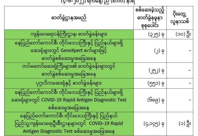 ကျန်းမာရေးဝန်ကြီးဌာနအနေဖြင့် နိုင်ငံအတွင်း ကူးစက်ဖြစ်ပွားနေသော COVID-19 ရောဂါ ကာကွယ်၊ ကုသ၊ ထိန်းချုပ်ရေးလုပ်ငန်းများကို အရှိန်အဟုန်မပြတ် ဆောင်ရွက်လျက်ရှိပါသည်။