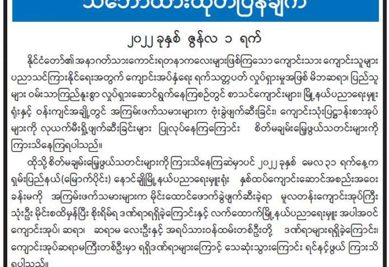၂၀၂၂-၂၀၂၃ ပညာသင်နှစ် အခြေခံပညာကျောင်းများကို ယနေ့နံနက်ပိုင်းတွင်စတင်ဖွင့်လှစ်၍ သက်ဆိုင်ရာအတန်းအလိုက်သင်ခန်းစာများ သင်ကြားပို့ချပေးလျက်ရှိသည်။
