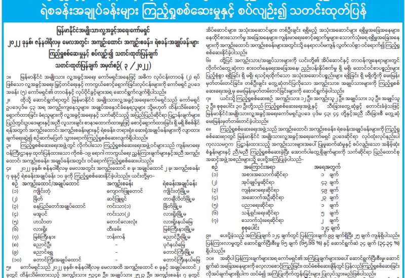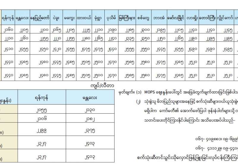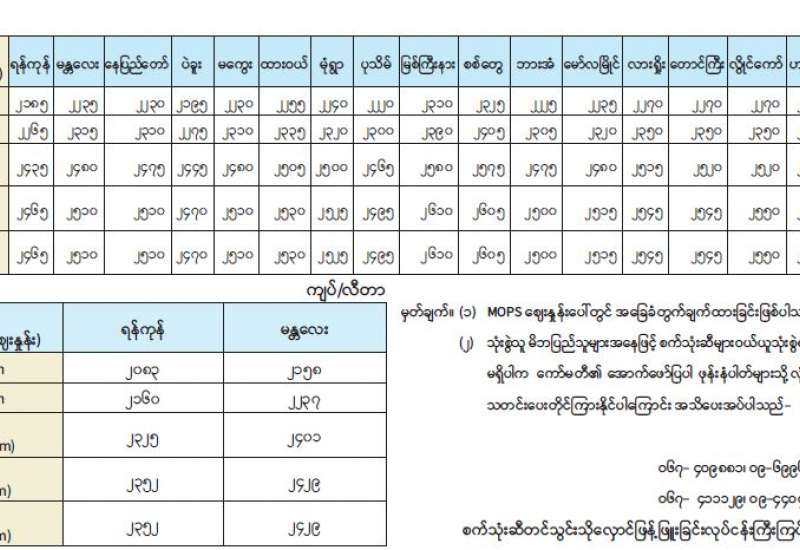 ရန်ကုန်မြို့နှင့် မန္တလေးမြို့အတွက် ရည်ညွှန်းလက်ကားဈေးနှုန်းများနှင့် ပြည်ထောင်စုနယ်မြေ နေပြည်တော်၊ တိုင်းဒေသကြီး/ပြည်နယ် မြို့တော်များအတွက် ရည်ညွှန်းလက်လီဈေးနှုန်းများ