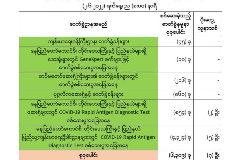 ကျန်းမာရေးဝန်ကြီးဌာနအနေဖြင့် နိုင်ငံအတွင်း ကူးစက်ဖြစ်ပွားနေသော COVID-19 ရောဂါ ကာကွယ်၊ ကုသ၊ ထိန်းချုပ်ရေးလုပ်ငန်းများကို အရှိန်အဟုန်မပြတ် ဆောင်ရွက်လျက်ရှိပါသည်။