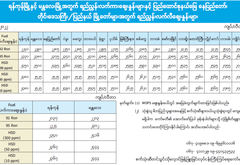 ရန်ကုန်မြို့နှင့် မန္တလေးမြို့အတွက် ရည်ညွှန်းလက်ကားဈေးနှုန်းများနှင့် ပြည်ထောင်စုနယ်မြေ နေပြည်တော် တိုင်ဒေသကြီး/ပြည်နယ် မြို့တော်များအတွက် ရည်ညွှန်းလက်လီဈေးနှုန်းများ