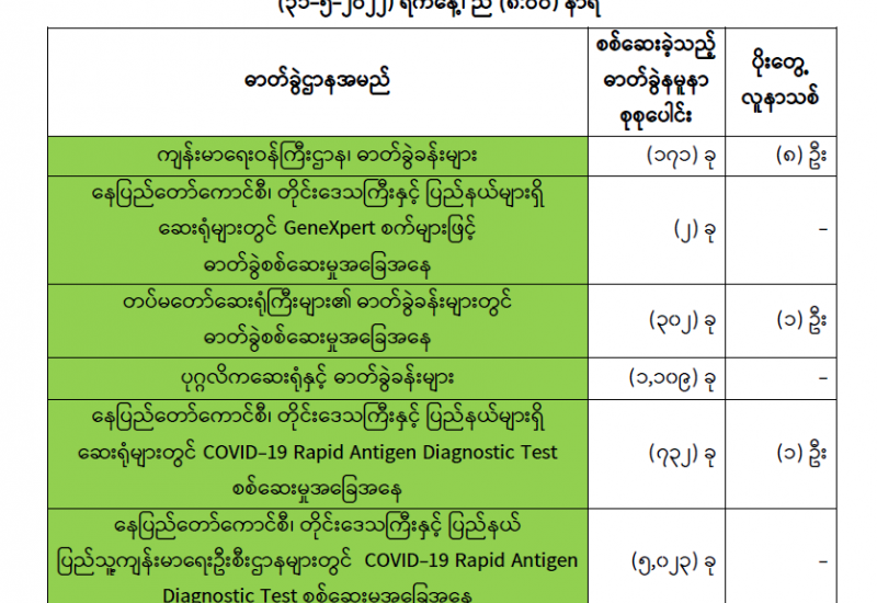 ကျန်းမာရေးဝန်ကြီးဌာနအနေဖြင့် နိုင်ငံအတွင်း ကူးစက်ဖြစ်ပွားနေသော COVID-19 ရောဂါ ကာကွယ်၊ ကုသ၊ ထိန်းချုပ်ရေးလုပ်ငန်းများကို အရှိန်အဟုန်မပြတ် ဆောင်ရွက်လျက် ရှိပါသည်။