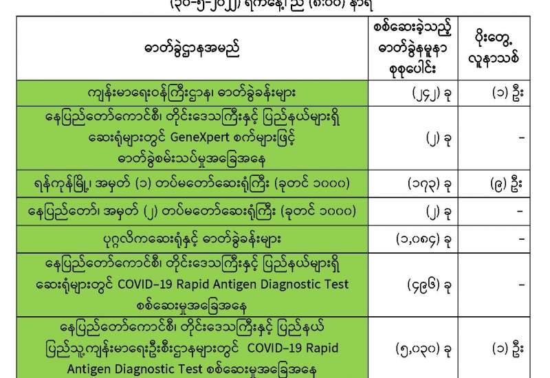 ကျန်းမာရေးဝန်ကြီးဌာနအနေဖြင့် နိုင်ငံအတွင်း ကူးစက်ဖြစ်ပွားနေသော COVID-19 ရောဂါ ကာကွယ်၊ ကုသ၊ ထိန်းချုပ်ရေးလုပ်ငန်းများကို အရှိန်အဟုန်မပြတ် ဆောင်ရွက်လျက်ရှိပါသည်။