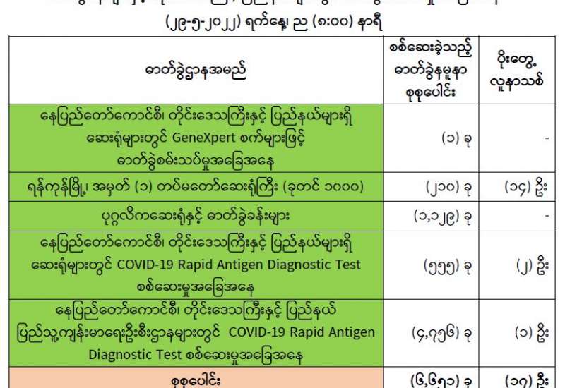 ကျန်းမာရေးဝန်ကြီးဌာနအနေဖြင့် နိုင်ငံအတွင်း ကူးစက်ဖြစ်ပွားနေသော COVID-19 ရောဂါ ကာကွယ်၊ ကုသ၊ ထိန်းချုပ်ရေးလုပ်ငန်းများကို အရှိန်အဟုန်မပြတ် ဆောင်ရွက်လျက်ရှိရာ ရောဂါထိန်းချုပ်ရေးလုပ်ငန်းများ အောင်မြင်နိုင်ရေးအတွက် ပြည်သူလူထုအနေဖြင့် ကျန်းမာရေးဝန်ကြီးဌာနမှ ထုတ်ပြန်ထားသော COVID-19 ရောဂါကာကွယ်ထိန်းချုပ်ရေးဆိုင်ရာ စည်းကမ်းများကို စနစ်တကျ လိုက်နာဆောင်ရွက်ရန်လိုအပ်ပြီး COVID-19 ကာကွယ်ဆေးထိုးနှံမှုခံယူခြင်းအား အထူးဂရုပြု ပူးပေါင်းဆောင်ရွက်ကြရန် လိုအပ်ပါသည်။