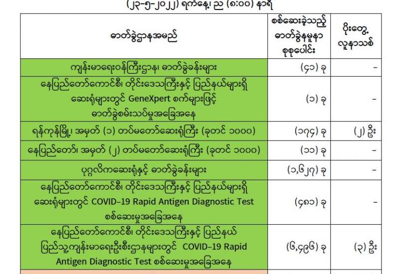 ကျန်းမာရေးဝန်ကြီးဌာနအနေဖြင့် နိုင်ငံအတွင်း ကူးစက်ဖြစ်ပွားနေသော COVID-19 ရောဂါ ကာကွယ်၊ ကုသ၊ ထိန်းချုပ်ရေးလုပ်ငန်းများကို အရှိန်အဟုန်မပြတ် ဆောင်ရွက်လျက်ရှိပါသည်။