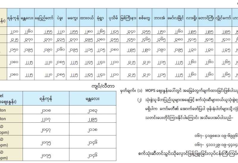 ရန်ကုန်မြို့နှင့် မန္တလေးမြို့အတွက် ရည်ညွှန်းလက်ကားဈေးနှုန်းများနှင့် ပြည်ထောင်စုနယ်မြေ နေပြည်တော်၊ တိုင်းဒေသကြီး/ပြည်နယ် မြို့တော်များအတွက် ရည်ညွှန်းလက်လီဈေးနှုန်းများ