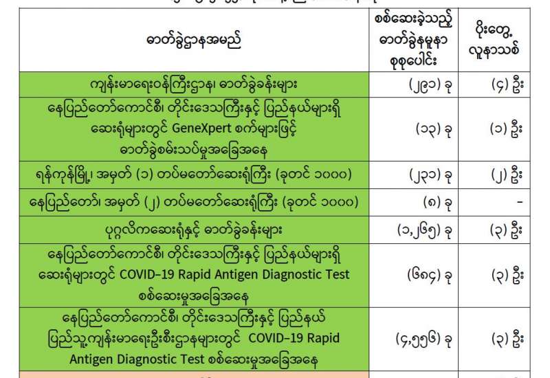 ကျန်းမာရေးဝန်ကြီးဌာနအနေဖြင့် နိုင်ငံအတွင်း ကူးစက်ဖြစ်ပွားနေသော COVID-19 ရောဂါ ကာကွယ်၊ ကုသ၊ ထိန်းချုပ်ရေးလုပ်ငန်းများကိုအရှိန်အဟုန်မပျက် ဆောင်ရွက်လျက်ရှိပါသည်။
