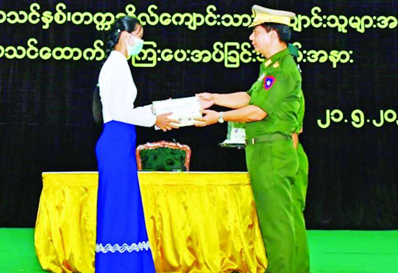 အလယ်ပိုင်းတိုင်းစစ်ဌာနချုပ် ၂၀၂၂-၂၀၂၃ ပညာသင်နှစ် တက္ကသိုလ်တက်ရောက်လျက်ရှိသော ကျောင်းသား၊ ကျောင်းသူများအတွက် ပညာသင်ထောက်ပံ့ငွေများပေးအပ်ခြင်းအခမ်းအနားကို ယနေ့နံနက်ပိုင်းတွင် တိုင်းစစ်ဌာနချုပ်ရန်အောင်မြင်ခန်းမ၌ကျင်းပရာ တိုင်းမှူးဗိုလ်ချုပ် ကိုကိုဦးနှင့် အရာရှိ၊ စစ်သည်၊ မိသားစုများ၊ ကျောင်းသား၊ ကျောင်းသူများတက်ရောက်ကြသည်။