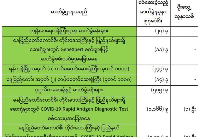 ကျန်းမာရေးဝန်ကြီးဌာနအနေဖြင့် နိုင်ငံအတွင်း ကူးစက်ဖြစ်ပွားနေသော COVID-19 ရောဂါ ကာကွယ်၊ ကုသ၊ ထိန်းချုပ်ရေးလုပ်ငန်းများကို အရှိန်အဟုန်မပြတ် ဆောင်ရွက်လျက်ရှိပါသည်။