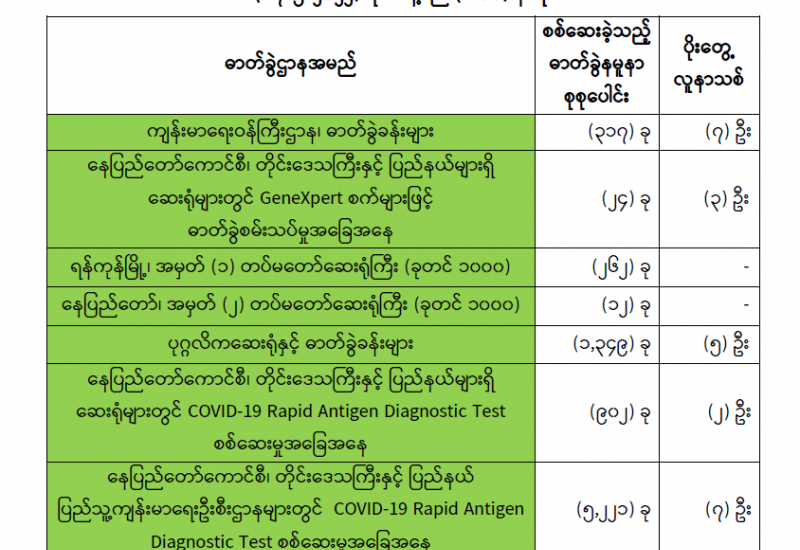 ကျန်းမာရေးဝန်ကြီးဌာနအနေဖြင့် နိုင်ငံအတွင်း ကူးစက်ဖြစ်ပွားနေသော COVID-19 ရောဂါ ကာကွယ်၊ ကုသ၊ ထိန်းချုပ်ရေးလုပ်ငန်းများကို အရှိန်အဟုန်မပျက် ဆောင်ရွက်လျက်ရှိပါသည်။