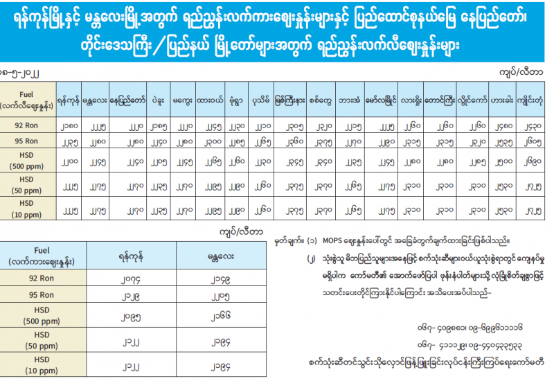 ရန်ကုန်မြို့နှင့် မန္တလေးမြို့အတွက် ရည်ညွှန်းလက်ကားဈေးနှုန်းများနှင့် ပြည်ထောင်စုနယ်မြေ နေပြည်တော်၊ တိုင်းဒေသကြီး/ ပြည်နယ် မြို့တော်များအတွက် ရည်ညွှန်းလက်လီဈေးနှုန်းများ