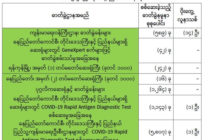 ကျန်းမာရေးဝန်ကြီးဌာနအနေဖြင့် နိုင်ငံအတွင်း ကူးစက်ဖြစ်ပွားနေသော COVID-19 ရောဂါ ကာကွယ်၊ ကုသ၊ ထိန်းချုပ်ရေးလုပ်ငန်းများကို အရှိန်အဟုန်မပျက် ဆောင်ရွက်လျက်ရှိရာ ရောဂါ ထိန်းချုပ်ရေးလုပ်ငန်းများ အောင်မြင်နိုင်ရေးအတွက် ပြည်သူလူထုအနေဖြင့် ကျန်းမာရေးဝန်ကြီးဌာနမှ ထုတ်ပြန်ထားသော COVID-19 ရောဂါကာကွယ်ထိန်းချုပ်ရေးဆိုင်ရာ စည်းကမ်းများကို စနစ်တကျ လိုက်နာဆောင်ရွက်ရန် လိုအပ်ပြီး COVID-19 ကာကွယ်ဆေးထိုးနှံမှု ခံယူခြင်းအား အထူးဂရုပြု ပူးပေါင်းဆောင်ရွက်ကြရန် လိုအပ်ပါသည်။