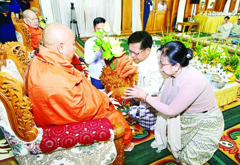 ကာကွယ်ရေးဦးစီးချုပ်ရုံး(ကြည်း၊ ရေ၊ လေ)မိသားစုများ၏ ၂၀၂၅ ခုနှစ်မဟာ ဘုံကထိန်အလှူတော်မင်္ဂလာအခမ်းအနားကို ယနေ့နံနက်ပိုင်းတွင် ကာကွယ်ရေးဦးစီးချုပ်ရုံး(ကြည်း) အနော်ရထာခန်းမ၌ ဆင်ယင်ကျင်းပပြုလုပ်ရာ နိုင်ငံတော်လုံခြုံရေးနှင့်အေးချမ်းသာယာရေးကော်မရှင်ဥက္ကဋ္ဌ တပ်မတော်ကာကွယ်ရေးဦးစီးချုပ် ဗိုလ်ချုပ်မှူးကြီး မင်းအောင်လှိုင်နှင့် ဇနီး ဒေါ်ကြူကြူလှတို့တက်ရောက်၍ ကထိန်လျာသင်္ကန်းနှင့် လှူဖွယ်ပစ္စည်းများ ဆက်ကပ်လှူဒါန်းသည်။