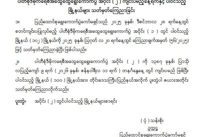 ပါတီစုံဒီမိုကရေစီအထွေထွေရွေးကောက်ပွဲအပိုင်း( ၂ )ကျင်းပမည့် နေ့ရက်နှင့်ပါဝင်သည့်မြို့နယ်များ သတ်မှတ်ကြေညာခြင်း
