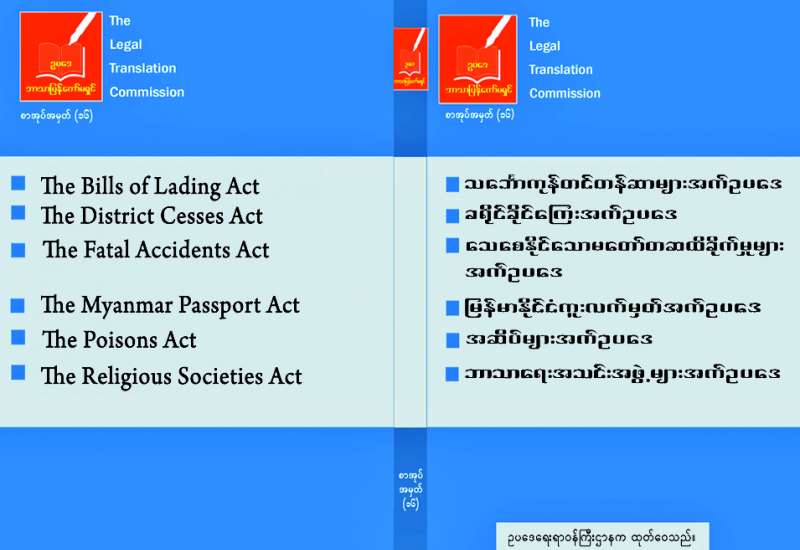 ဥပဒေရေးရာဝန်ကြီးဌာနသည် ဥပဒေဘာသာပြန်ကော်မရှင်က မြန်မာဘာသာသို့ ပြန်ဆိုပြီးသည့် ဥပဒေများကို စာအုပ်ထုတ်ဝေလျက်ရှိရာ ဘာသာပြန်စာအုပ် အမှတ်(၁၆)ကိုထုတ်ဝေပြီး ဖြစ်သည်။