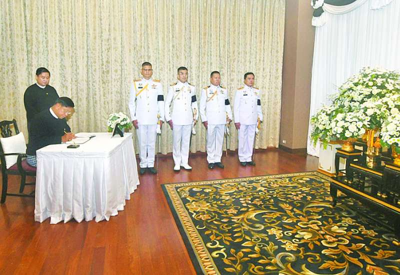ထိုင်းနိုင်ငံ ဘုရင်မင်းမြတ်၏ မယ်တော်မိဖုရားကြီး Her Maje-sty Queen Sirikit သည် ၂၀၂၅ ခုနှစ် အောက်တိုဘာ ၂၄ ရက်တွင် ကံတော်ကုန်သွားခဲ့ခြင်းအတွက် ပြည်ထောင်စုသမ္မတမြန်မာနိုင်ငံအစိုးရကိုယ်စား နိုင်ငံတော်သမ္မတရုံး ဝန်ကြီးဌာန(၁) ပြည်ထောင်စုဝန်ကြီး ဦးတင်အောင်စန်းသည် အမှတ် ၉၄၊ ပြည်လမ်း၊ ဒဂုံမြို့နယ်၊ ရန်ကုန်မြို့ရှိ မြန်မာနိုင်ငံဆိုင်ရာ ထိုင်းနိုင်ငံသံရုံး၌ ဖွင့်လှစ်ထားသည့် ဝမ်းနည်းကြောင်းမှတ်တမ်းစာအုပ်၌ ယနေ့မွန်းလွဲပိုင်းတွင် သွားရောက်လက်မှတ်ရေးထိုးသည်။