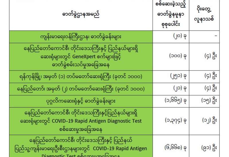(၂၇-၃-၂၀၂၂) ရက်နေ့၊ ည (၈:၀၀) နာရီ ကျန်းမာရေးဝန်ကြီးဌာနအနေဖြင့် နိုင်ငံအတွင်း ကူးစက်ဖြစ်ပွားနေသော COVID-19 ရောဂါ ကာကွယ်၊ ကုသ၊ ထိန်းချုပ်ရေး လုပ်ငန်းများကို အရှိန်အဟုန်မြှင့်ဆောင်ရွက်လျက်ရှိရာ ရောဂါထိန်းချုပ်ရေးလုပ်ငန်းများ အောင်မြင်နိုင်ရေးအတွက် ပြည်သူလူထု အနေဖြင့် ကျန်းမာရေးဝန်ကြီးဌာနမှ ထုတ်ပြန်ထားသော COVID-19 ရောဂါကာကွယ်ထိန်းချုပ်ရေးဆိုင်ရာ စည်းကမ်းများကို စနစ် တကျလိုက်နာ ဆောင်ရွက်ရန်လိုအပ်ပြီး COVID-19 ကာကွယ်ဆေးထိုးနှံမှုခံယူခြင်းအား အထူးဂရုပြု ပူးပေါင်းဆောင်ရွက်ကြရန် လိုအပ်ပါသည်။