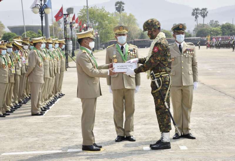 (၇၇)နှစ်မြောက်တပ်မတော်နေ့ စစ်ရေးပြအခမ်းအနားတွင် ဆုရရှိကြသော စစ်ရေးပြတပ်ခွဲများအား ဂုဏ်ပြုဆုချီးမြှင့်ပွဲကို ယနေ့နံနက်ပိုင်းတွင် နေပြည်တော်ရှိ စုရပ် သစ်တပ်စစ်ရေးပြကွင်း၌ ကျင်းပပြုလုပ်ရာ တပ်မတော်နေ့ကျင်းပရေးဦးစီး ကော်မတီ ဥက္ကဋ္ဌ ညှိနှိုင်းကွပ်ကဲရေးမှူး(ကြည်း၊ ရေ၊ လေ) ဗိုလ်ချုပ်ကြီး မောင်မောင်အေး တက်ရောက်၍ ဆုများကို ပေးအပ်ချီးမြှင့်သည်။