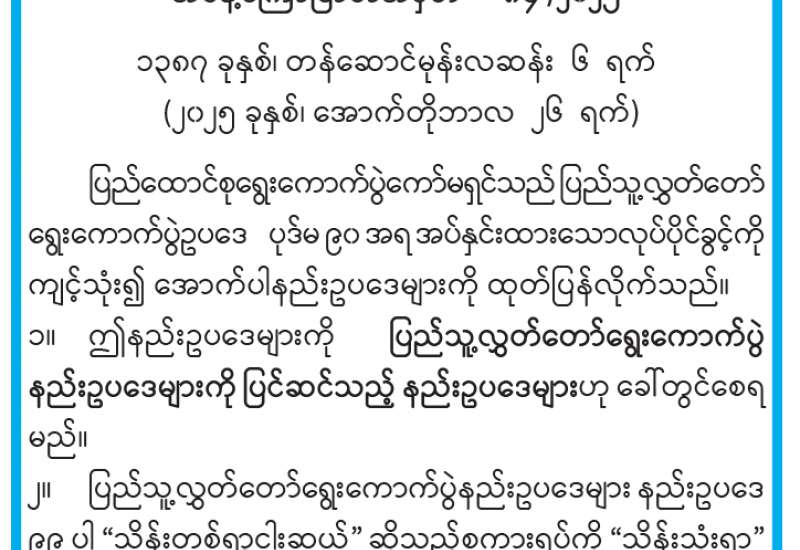 တိုင်းဒေသကြီးလွှတ်တော် သို့မဟုတ် ပြည်နယ်လွှတ်တော်ရွေးကောက်ပွဲနည်းဥပဒေများ ပြင်ဆင်ထုတ်ပြန်
