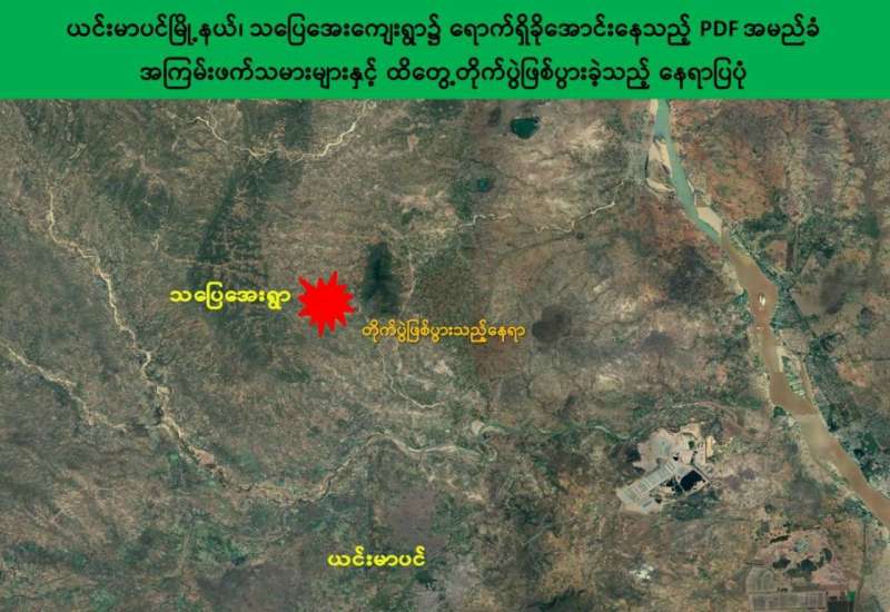 စစ်ကိုင်းတိုင်းဒေသကြီး၊ ယင်းမာပင်မြို့နယ်အတွင်း အချို့ကျေးရွာများ၌ PDF အမည်ခံအကြမ်းဖက်သမားများ ရောက်ရှိခိုအောင်းလျက်ရှိပြီး ဒေသတွင်းဆူပူအကြမ်း ဖက်မှုများဖြစ်ပေါ်လာစေရန် စည်းရုံးလှုံ့ဆော်ခြင်း၊ အပြစ်မဲ့ပြည်သူများနှင့် နိုင်ငံ့ဝန်ထမ်း များအား သတ်ဖြတ်ခြင်း၊ အများပြည်သူနှင့် သက်ဆိုင်သည့်နေရာများအား မိုင်းထောင်၊ မိုင်းခွဲခြင်း၊ မီးရှို့ဖျက်ဆီးခြင်း၊ ဒေသခံပြည်သူလူထုနှင့် ခရီးသွားပြည်သူများအား အဓမ္မ ခြိမ်းခြောက် ဆက်ကြေးတောင်းခံခြင်း စသည့်အဖျက်အမှောင့်လုပ်ရပ်များကို လုပ်ဆောင် နေကြောင်း ရိုးသားစွာ နေထိုင်လုပ်ကိုင်စားသောက်လိုသည့် တာဝန်သိပြည်သူအချို့က သတင်းပေးပို့လာသဖြင့် လုံခြုံရေးတပ်ဖွဲ့ဝင်များက ယနေ့တွင် သွားရောက်ရှာဖွေဖော် ထုတ်ဖမ်းဆီးစဉ် ယင်းမာပင်မြို့နယ်၊ သပြေအေးကျေးရွာ ဘုန်းတော်ကြီးကျောင်း၌ ရောက်ရှိခိုအောင်းနေသည့် PDF အမည်ခံ အကြမ်းဖက်သမားများနှင့် အပြန်အလှန် ထိတွေ့တိုက်ပွဲဖြစ်ပွားခဲ့ပြီး အကြမ်းဖက်သမားများသည် ကျေးရွာ၏ မြောက်ဘက်နှင့် အနောက်ဘက်သို့ ဖရိုဖရဲ ဆုတ်ခွဲထွက်ပြေးသွားခဲ့သည်။