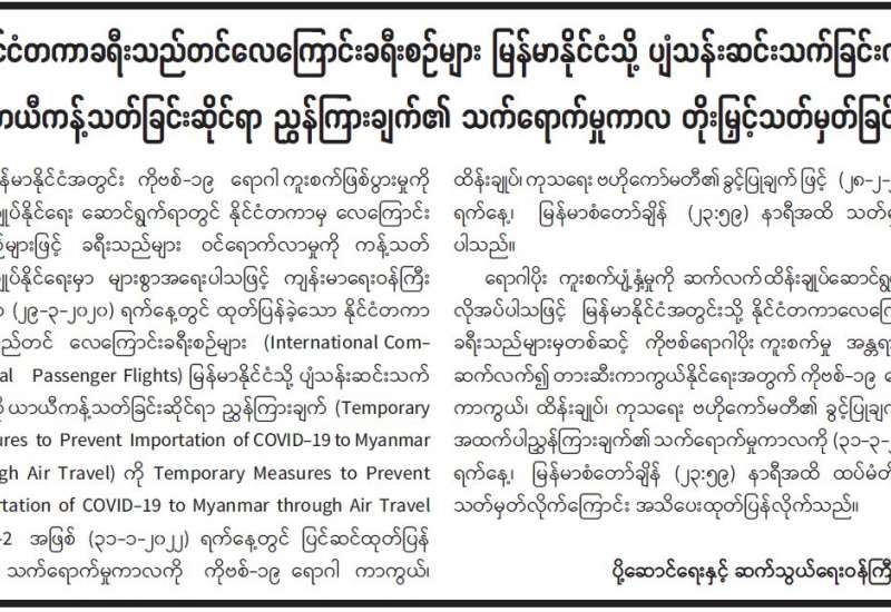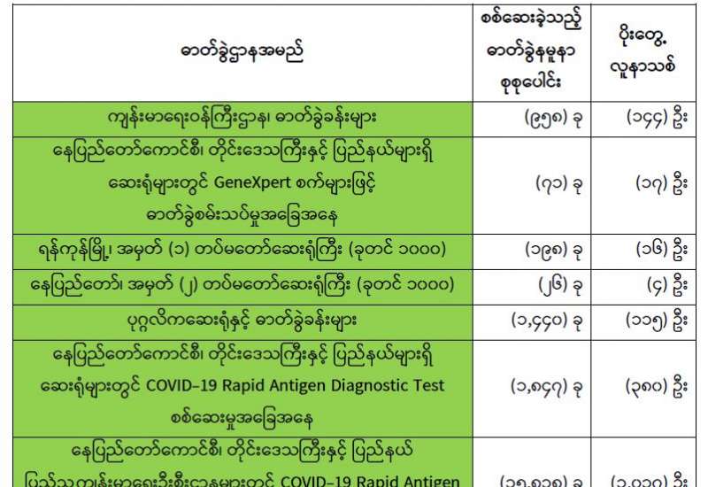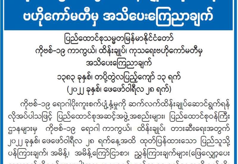 ကျန်းမာရေးဝန်ကြီးဌာနအနေဖြင့် နိုင်ငံအတွင်း ကူးစက်ဖြစ်ပွားနေသော COVID-19 ရောဂါ ကာကွယ်၊ ကုသ၊ ထိန်းချုပ်ရေးလုပ်ငန်းများကို အရှိန်အဟုန်မြှင့် ဆောင်ရွက်လျက်ရှိပါသည်။