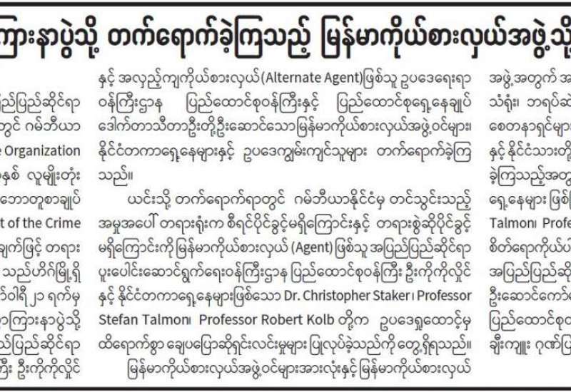 ၁။ လူမျိုးတုံးစေမှုကို တားဆီးရန်နှင့် ပြစ်ဒဏ်ပေးရန် နိုင်ငံတကာသဘောတူစာချုပ်ကို ကျူးလွန်သည်ဟူသော စွပ်စွဲချက်ဖြင့် ဂမ်ဘီယာနိုင်ငံမှ OIC အဖွဲ့ကိုယ်စားပြု၍ အပြည်ပြည်ဆိုင်ရာတရားရုံး ICJ တွင် တရားစွဲဆိုခဲ့ပါသည်။