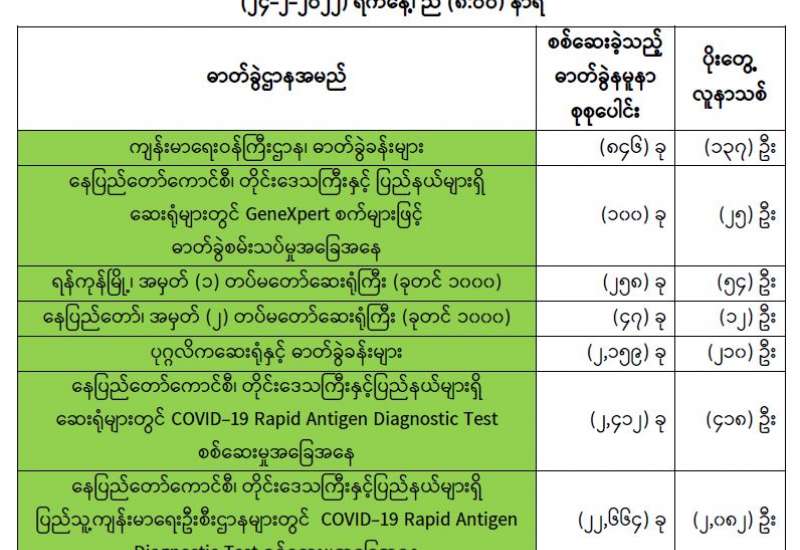 ကျန်းမာရေးဝန်ကြီးဌာနအနေဖြင့် နိုင်ငံအတွင်း ကူးစက်ဖြစ်ပွားနေသော COVID-19 ရောဂါ ကာကွယ်၊ ကုသ၊ ထိန်းချုပ်ရေး လုပ်ငန်းများကို အရှိန်အဟုန်မြှင့် ဆောင်ရွက်လျက်ရှိပါသည်။