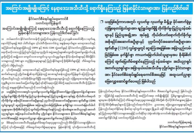 အကြမ်းဖက်အုပ်စုအဖြစ်ကြေငြာထားသော CRPH၊ NUG နှင့် ယင်းတို့၏ လက်အောက်ခံ အဖွဲ့အစည်းများ၊ ယင်းတို့နှင့် ဆက်နွယ်နေသော အဖွဲ့အစည်းများ၊ လူပုဂ္ဂိုလ်များသည် နိုင်ငံတော် တည်ငြိမ်အေးချမ်းရေးကို ပျက်ပြားစေရန်နှင့် ပြည်သူလူထုကို အကြောက်တရားများ ဖြစ်ပေါ်စေပြီး အစိုးရယန္တရားများ ပျက်ပြားစေရန် ရည်ရွယ်လျက် လှုံ့ဆော်ခြင်း၊ ဝါဒဖြန့်ခြင်း၊ ခြိမ်းခြောက်ခြင်းများကို လူမှုကွန်ရက်များမှတစ်ဆင့် နည်းမျိုးစုံဖြင့် ပြုလုပ်လျက်ရှိပါသည်။