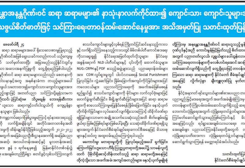 ဝန်ထမ်းကျင့်ဝတ်များနှင့်အညီ နိုင်ငံတော်အပေါ်သစ္စာစောင့်သိ၍ အလုပ်တာဝန်များကို ထမ်းဆောင်လျက်ရှိသည့် နိုင်ငံ့ဝန်ထမ်း များအား အကြမ်းဖက်သမားများအနေဖြင့် လူအုပ်စုဖွဲ့၍ လက်နက်အားကိုးဖြင့် အနိုင်အထက်ပြုကျင့်ကာ အတင်းအကြပ် CDM ပြုလုပ်စေပြီး CDM ပြုလုပ်ခြင်းမရှိသူ နိုင်ငံ့ဝန်ထမ်းများနှင့် အေးချမ်းစွာ နေထိုင်လျက်ရှိသော ပြည်သူလူထုများအား “သူလျှို၊ ဒလန်၊ သတင်းပေး” ဟုစွပ်စွဲကာ ဖမ်းဆီးသတ်ဖြတ်ခြင်းများ ပြုလုပ်လျက်ရှိရာ ဖေဖော်ဝါရီလ ၂၂ ရက်နေ့၌ စစ်ကိုင်း တိုင်းဒေသကြီး၊ ကောလင်းမြို့နယ်၌ PDF အမည်ခံ အကြမ်းဖက်သမားများက မင်းကုန်းကျေးရွာနေ ရပ်/ကျေးစာရေး အမျိုးသမီး တစ်ဦးအား ရက်စက်စွာသတ်ဖြတ်ခဲ့ကြောင်း သိရသည်။