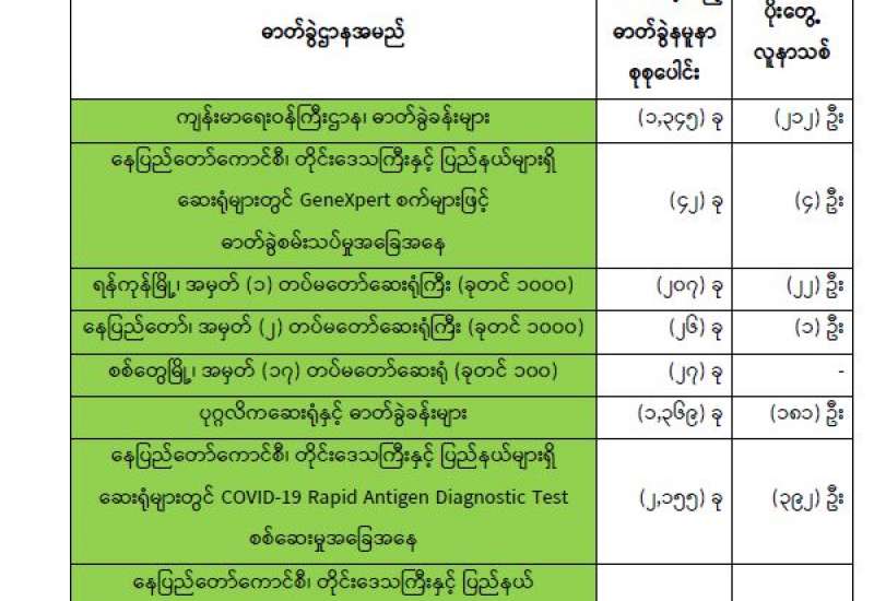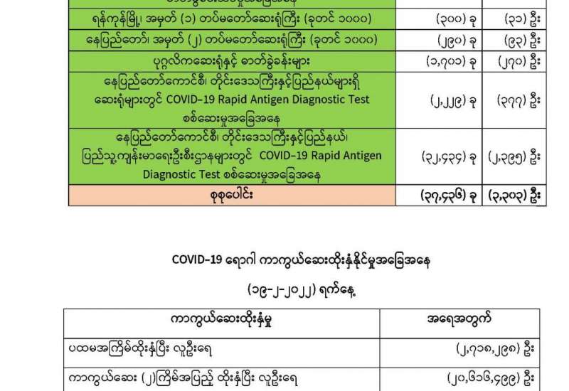 ကျန်းမာရေးဝန်ကြီးဌာနအနေဖြင့် နိုင်ငံအတွင်း ကူးစက်ဖြစ်ပွားနေသော COVID-19 ရောဂါ ကာကွယ်၊ ကုသ၊ ထိန်းချုပ်ရေးလုပ်ငန်းများကို အရှိန်အဟုန်မြှင့် ဆောင်ရွက်လျက်ရှိပါသည်။
