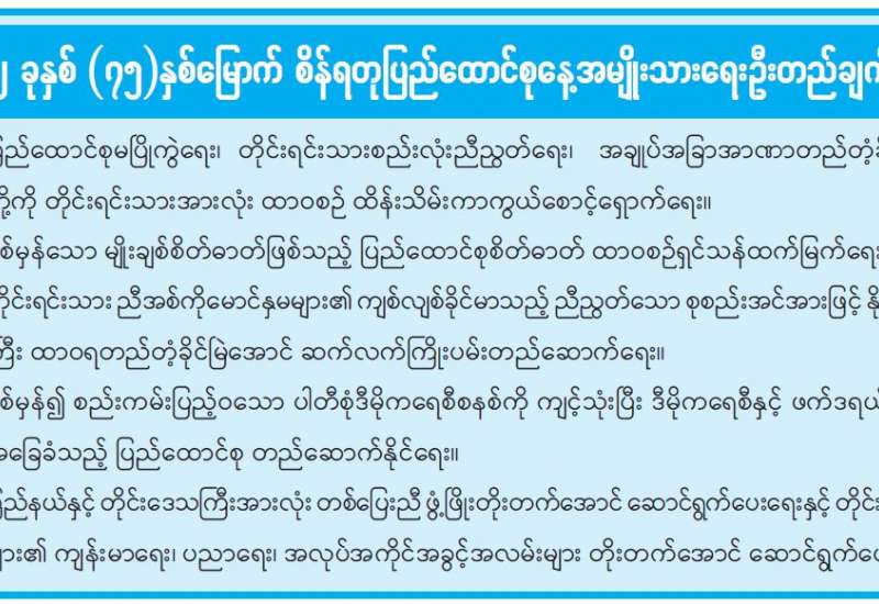 စနစ်တကျ ချွေတာသုံးစွဲ နေ့စဉ်လူမှုဘဝများတွင် ရေနှင့်မီး(လျှပ်စစ်)တို့က မရှိမဖြစ် အရေး ကြီးသည်။ သန့်ရှင်း၍ ဘေးကင်းသည့်သောက်သုံးရေနှင့် လျှပ်စစ် မီးတို့ကို မိမိတို့နိုင်ငံ၏ မြို့ပြနှင့် ကျေးလက်ဒေသအသီးသီးတို့ရှိ အိမ်ထောင်စုများအားလုံး သုံးစွဲခွင့်မရရှိသေး။ အိမ်တိုင်း၊ မိသားစုတိုင်း သောက်သုံးရေရရှိရေးနှင့် လျှပ်စစ်မီး ရရှိရေးအတွက် ကြိုးပမ်းနေရဆဲအခြေ အနေတွင်သာ ရှိသေးသည်။