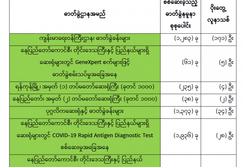 ကျန်းမာရေးဝန်ကြီးဌာနအနေဖြင့် နိုင်ငံအတွင်း ကူးစက်ဖြစ်ပွားနေသော COVID-19 ရောဂါကာကွယ်၊ ကုသ၊ ထိန်းချုပ်ရေးလုပ်ငန်းများကို အရှိန်အဟုန်မြှင့် ဆောင်ရွက်လျက်ရှိပါသည်။