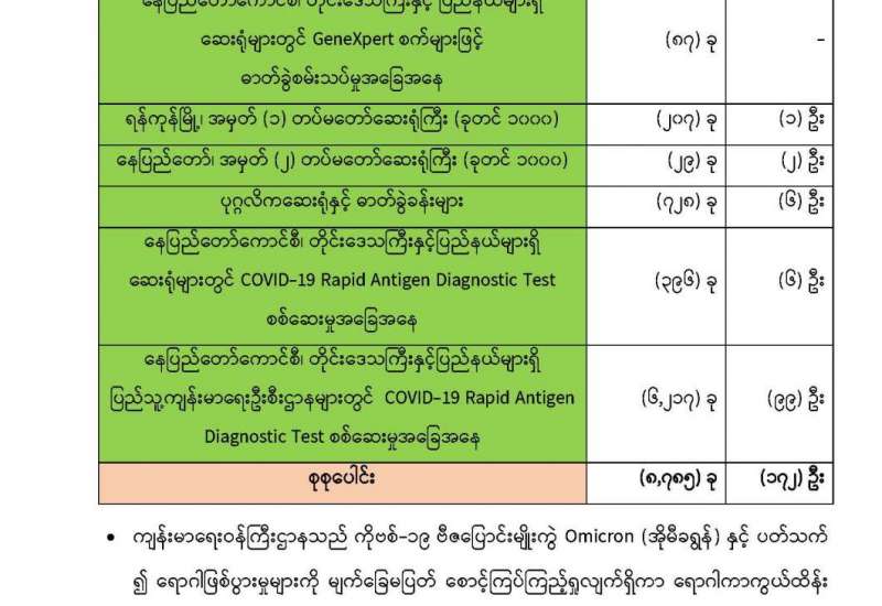 ကျန်းမာရေးဝန်ကြီးဌာနအနေဖြင့် နိုင်ငံအတွင်း ကူးစက်ဖြစ်ပွားနေသော COVID-19 ရောဂါ ကာကွယ်၊ ကုသ၊ ထိန်းချုပ်ရေးလုပ်ငန်းများကို အရှိန်အဟုန်မြှင့် ဆောင်ရွက်လျက်ရှိပါသည်။