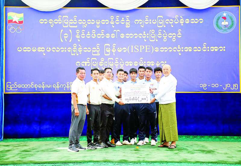 သုံးနိုင်ငံဖိတ်ခေါ်ဖလား အမျိုးသားဘောလုံးပြိုင်ပွဲတွင် ပထမဆုဖလားရရှိခဲ့သည့် အားကစားနှင့်လူငယ်ရေးရာဝန်ကြီးဌာန၊ အားကစားနှင့်ကာယပညာသိပ္ပံ မြန်မာ ISPE အမျိုးသားဘောလုံးအသင်းအား ဂုဏ်ပြုချီးမြှင့်ခြင်းအခမ်းအနားကို ယမန်နေ့ နံနက်ပိုင်းတွင် ရန်ကုန်တိုင်းဒေသကြီး တာမွေမြို့နယ် အားကစားနှင့်ကာယပညာသိပ္ပံ(ရန်ကုန်)ရှိ ပြည်ထောင်စုခန်းမ၌ ကျင်းပသည်။
