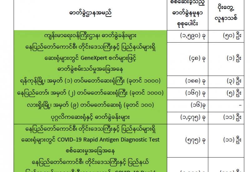 ကျန်းမာရေးဝန်ကြီးဌာနအနေဖြင့် နိုင်ငံအတွင်း ကူးစက်ဖြစ်ပွားနေသော COVID-19 ရောဂါ ကာကွယ်၊ ကုသ၊ ထိန်းချုပ်ရေးလုပ်ငန်းများကို အရှိန်အဟုန်မြှင့် ဆောင်ရွက်လျက်ရှိပါသည်။