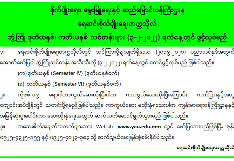 ၁။ မွေးမြူရေးဆိုင်ရာဆေးတက္ကသိုလ်တွင် သင်ကြားပို့ချလျက်ရှိသော (၂၀၁၉-၂၀၂၀) ပညာသင်နှစ်အတွက် အောက်ဖော်ပြပါ ဘွဲ့ကြို သင်တန်းအသီးသီးကို (၃-၂-၂၀၂၂) ရက်နေ့တွင် စတင်ဖွင့်လှစ်မည် ဖြစ်ပါသည်-