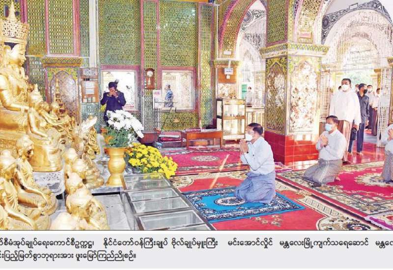နိုင်ငံတော်စီမံအုပ်ချုပ်ရေးကောင်စီဥက္ကဋ္ဌ၊ နိုင်ငံတော်ဝန်ကြီးချုပ် ဗိုလ်ချုပ်မှူးကြီး မင်းအောင်လှိုင်သည် အဖွဲ့ဝင်များ၊ မန္တလေးတိုင်းဒေသကြီး ဝန်ကြီးချုပ်၊ အလယ်ပိုင်းတိုင်းစစ်ဌာနချုပ်တိုင်းမှူးနှင့် တာဝန်ရှိသူများ လိုက်ပါ၍ ယနေ့နံနက်ပိုင်းတွင် မန္တလေးတိုင်းဒေသကြီး ချမ်းမြသာစည် မြို့နယ်ရှိ မဟာမုနိ ရုပ်ရှင်တော်မြတ်ကြီးအား သွားရောက် ဖူးမြော်ကြည်ညိုသည်။