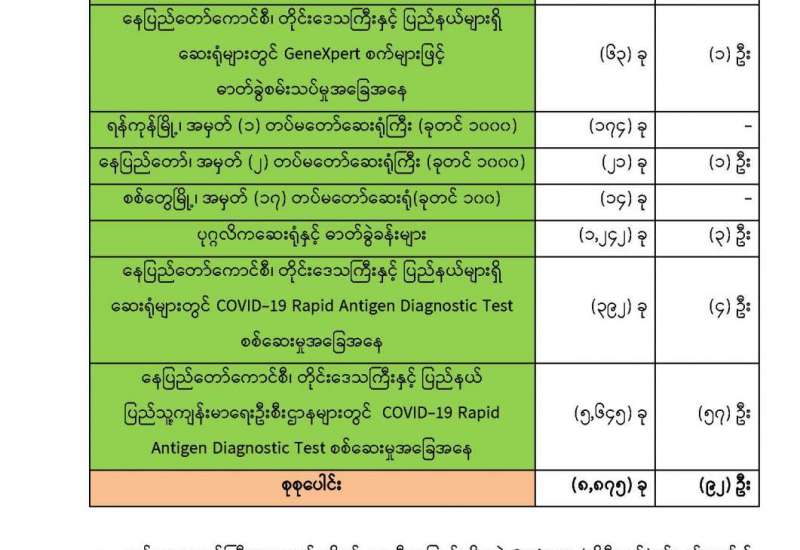 ကျန်းမာရေးဝန်ကြီးဌာနအနေဖြင့် နိုင်ငံအတွင်း ကူးစက်ဖြစ်ပွားနေသော COVID-19 ရောဂါ ကာကွယ်၊ ကုသ၊ ထိန်းချုပ်ရေးလုပ်ငန်းများကို အရှိန်အဟုန်မြှင့် ဆောင်ရွက်လျက်ရှိပါသည်။