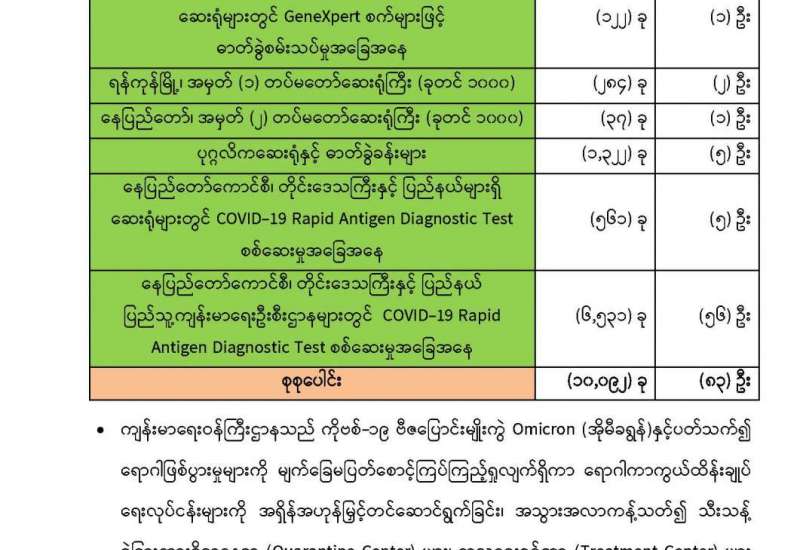 ကျန်းမာရေးဝန်ကြီးဌာနအနေဖြင့် နိုင်ငံအတွင်း ကူးစက်ဖြစ်ပွားနေသော COVID-19 ရောဂါ ကာကွယ်၊ ကုသ၊ ထိန်းချုပ်ရေးလုပ်ငန်းများကို အရှိန်အဟုန်မြှင့် ဆောင်ရွက်လျက်ရှိပါသည်။