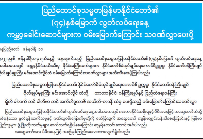 ၁။ ပြည်ထောင်စုသမ္မတ မြန်မာနိုင်ငံတော်အနေဖြင့် ကမ္ဘာ့ကျန်းမာရေးအဖွဲ့ (WHO) ၏ သတ်မှတ်ပြဋ္ဌာန်းချက်များနှင့်အညီ ကိုဗစ်-၁၉ ရောဂါပျံ့နှံ့မှုအား ကာကွယ်နိုင်ရန်အတွက် ပြည်ပ/ ပြည်တွင်း လိုက်နာရမည့် လုပ်ငန်းစဉ်များအား အပြည့်အဝ ချမှတ်ဆောင်ရွက်လျက်ရှိ သည်။ လတ်တလော ကမ္ဘာ့နိုင်ငံအသီးသီးတွင် ဖြစ်ပွားနေသည့် အိုမီခရွန်ဗိုင်းရပ်စ်ဗီဇမျိုးကွဲ ကူးစက်ပျံ့နှံ့မှုအား ကာကွယ်ထိန်းချုပ်နိုင်ရန် အတွက်ကျန်းမာရေးဝန်ကြီးဌာနမှ ၁၆-၁၂-၂၀၂၁ ရက်နေ့တွင် ထုတ်ပြန်ထားသော “အပြည်ပြည်ဆိုင်ရာ ဝင်/ထွက်ဂိတ်များနှင့် နယ်စပ်ဝင်/ ထွက်ဂိတ်များမှ မြန်မာနိုင်ငံသို့ လာရောက်မည့် ခရီးသွားများအတွက် အသွားလာကန့်သတ်မှုနှင့် ဓါတ်ခွဲစမ်းသပ် စစ်ဆေးခြင်း ဆောင်ရွက်မည့်အစီအစဉ်နှင့်စပ်လျဉ်း၍ ထပ်မံဖြည့်စွက်ထား သည့် လုပ်ငန်းစဉ်” ကြေညာချက်ကို ယင်းနေ့၌ပင် ရန်ကုန်မြို့အခြေစိုက် နိုင်ငံခြားသံရုံးများ၊ ကုလသမဂ္ဂဆိုင်ရာ အဖွဲ့အစည်းများနှင့် အပြည်ပြည်ဆိုင်ရာအဖွဲ့အစည်းများသို့ ပေးပို့ထားပြီး ယင်းအတိုင်း လိုက်နာရန် အသိပေးပြီးဖြစ်သည်။