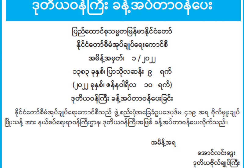 ဝန်ထမ်းများ၏ စွမ်းဆောင်ရည်မြင့်မားရေးနှင့် လုပ်ငန်းခွင်ကျွမ်းကျင်မှုရှိစေရန် ရည်ရွယ်၍ ဆောက်လုပ်ရေးဝန်ကြီးဌာန၊ အဆောက်အဦ၊ လမ်း၊ တံတား၊ မြို့ပြနှင့် အိမ်ရာဖွံ့ဖြိုးရေးဦးစီးဌာနနှင့် ကျေးလက်လမ်းဖွံ့ဖြိုးရေးဦးစီးဌာနတို့မှ ဝန်ထမ်းသစ်များ၏ လုပ်ငန်းခွင်ဝင် သင်တန်းအမှတ်စဉ် (၁/၂၀၂၂) ဖွင့်ပွဲအခမ်းအနားကို ယနေ့နံနက်(၁၀) နာရီတွင် နေပြည်တော်ဆောက်လုပ်ရေးဝန်ကြီးဌာန စုဝေးခန်းမ ဆောင်၌ကိုဗစ်-၁၉ ညွှန်ကြားချက်များနှင့်အညီ ကျင်းပသည်။