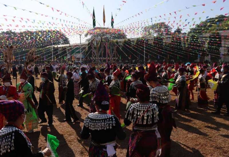 (၇၄)နှစ်မြောက် ကချင်ပြည်နယ်နေ့ အခမ်းအနားကို ယနေ့နံနက်ပိုင်းတွင် ကချင်ပြည်နယ်၊ အစိုးရအဖွဲ့ရုံး မြက်ခင်းပြင်၌ ပြုလုပ်ရာ နိုင်ငံတော်စီမံအုပ်ချုပ်ရေးကောင်စီအဖွဲ့ဝင် Jeng Phang နော်တောင်၊ ဦးမောင်းဟာ၊ ဦးစိုင်းလုံးဆိုင်၊ ဦးရွှေကြိမ်း၊ ပြည်ထောင်စုဝန်ကြီးများ ဖြစ်ကြသည့် ဒုတိယဗိုလ်ချုပ်ကြီး ထွန်းထွန်းနောင်၊ ဦးခင်ရီ၊ ဦးစောထွန်းအောင်မြင့်၊ ကချင်ပြည်နယ်ဝန်ကြီးချုပ် ဦးခက်ထိန်နန်နှင့် အဖွဲ့ဝင်များ၊ မြောက်ပိုင်းတိုင်းစစ်ဌာနချုပ် တိုင်းမှူး ဗိုလ်မှူးချုပ် မြတ်သက်ဦးနှင့် အဖွဲ့ဝင်များ၊ ဌာနဆိုင်ရာများမှ တာဝန်ရှိသူများနှင့် ဒေသခံတိုင်းရင်းသားပြည်သူများ တက်ရောက်ကြသည်။