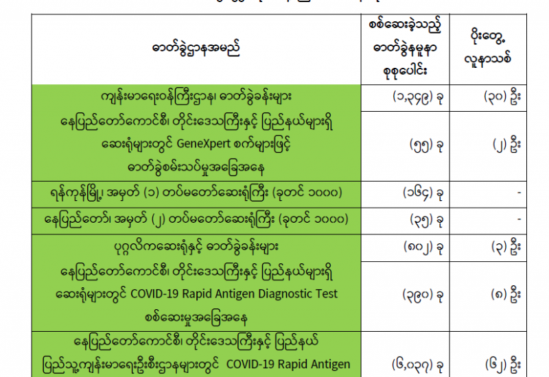 (၁၀-၁-၂၀၂၂) ရက်နေ့၊ ည (၈:၀၀) နာရီ ကျန်းမာရေးဝန်ကြီးဌာနအနေဖြင့် နိုင်ငံအတွင်း ကူးစက်ဖြစ်ပွားနေသော COVID-19 ရောဂါ ကာကွယ်၊ ကုသ၊ ထိန်းချုပ်ရေးလုပ်ငန်းများကို အရှိန်အဟုန်မြှင့် ဆောင်ရွက်လျက်ရှိပါသည်။