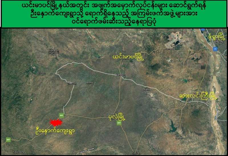 စစ်ကိုင်းတိုင်းဒေသကြီး၊ ယင်းမာပင်မြို့နယ်အတွင်း အကြမ်းဖက်လုပ်ငန်းများ လုပ်ဆောင်ရန်အတွက် ဦးနှောက်ကျေးရွာ၌ အစည်းအဝေး ပြုလုပ်ရန်စုဝေးနေသည့် PDF အမည်ခံ အကြမ်းဖက်သမားများအား လုံခြုံရေးတပ်ဖွဲ့ဝင်များက ယနေ့တွင် သွားရောက်ဖမ်းဆီးခဲ့ရာ အပြန်အလှန်ပစ်ခတ်မှု ဖြစ်ပွားခဲ့ပြီး အကြမ်းဖက်သမားများထံမှ အလောင်း ၅ လောင်း၊ လက်နက်၊ ခဲယမ်းနှင့် ဆက်စပ်ပစ္စည်းအချို့ သိမ်းဆည်းရမိခဲ့သည်။